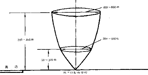 4.3.3 指點信標臺向空中發射垂直扇型波束。其覆蓋區為,高度50—100m時,縱向寬度為200—400m;高度200—400m時,縱向寬度為400—800m(圖 5)。
